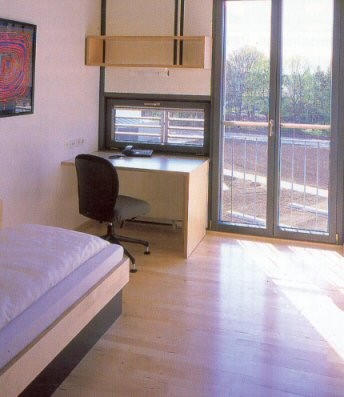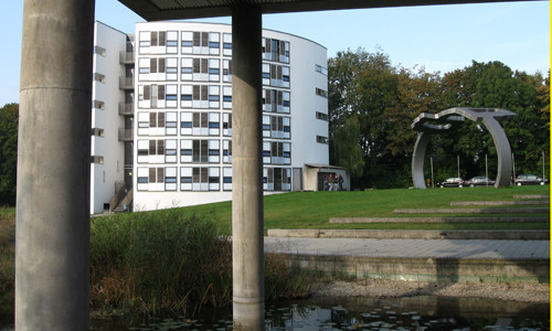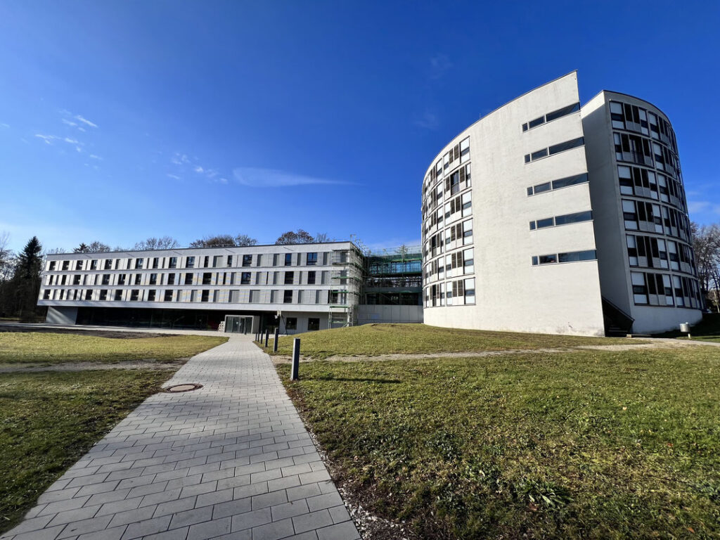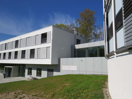 Wohnheim mit Aufstockung Flachbau (3. Stock), jetzt 243 Betten, rechts Wohnturm von 1995, Foto von 11/2023, Peter J. Hoffmann
